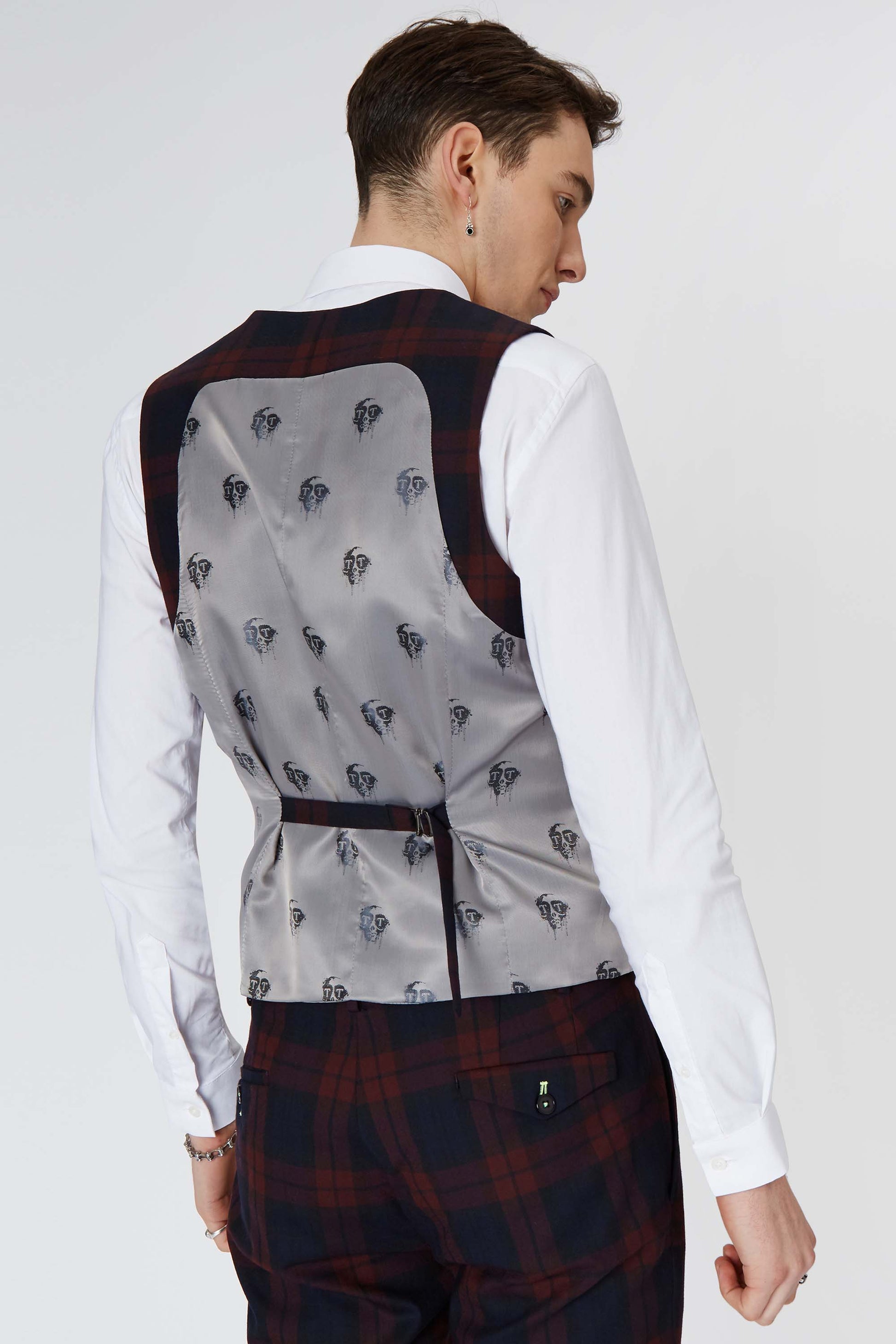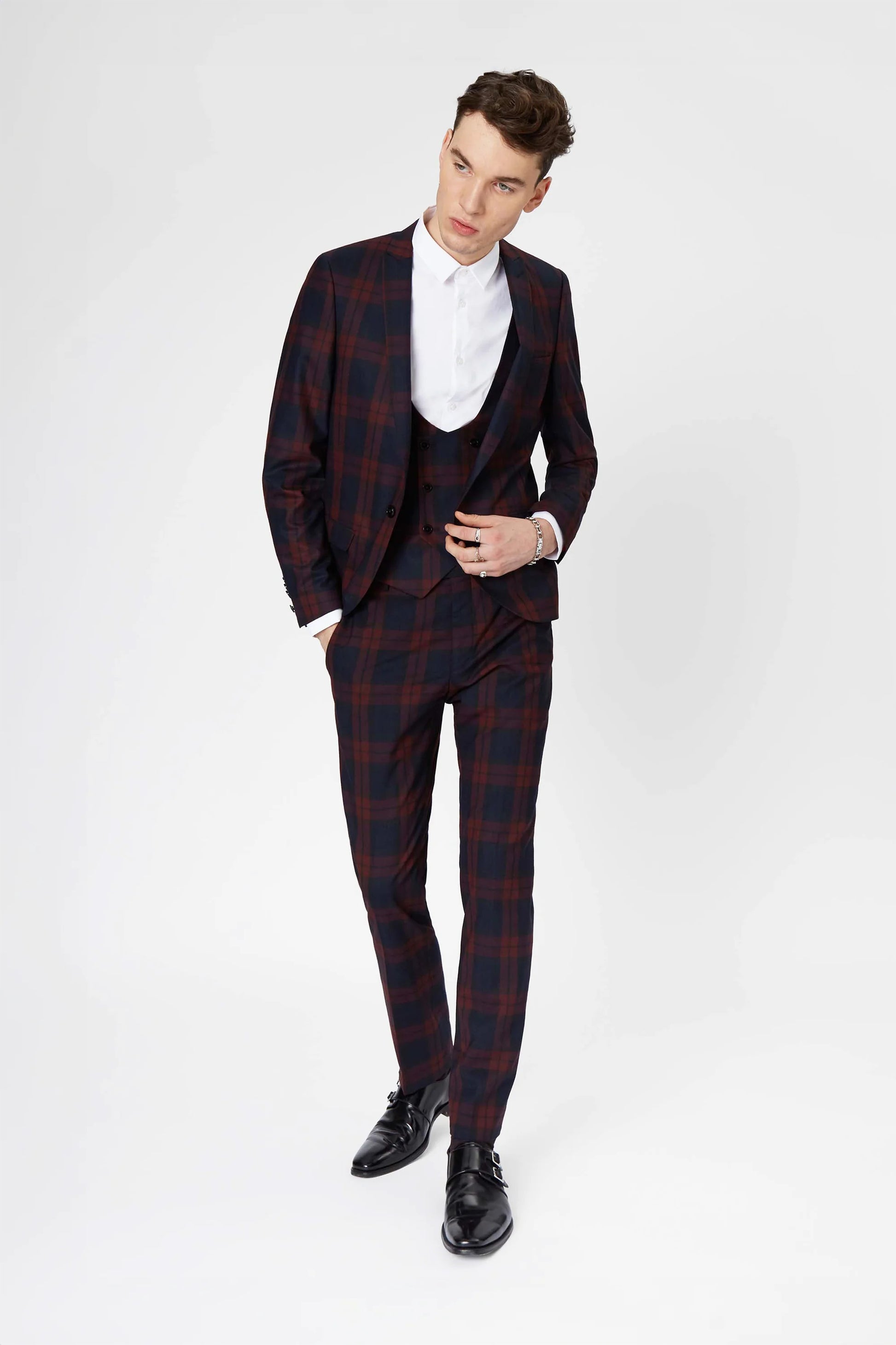 Take a daring step in The Ginger Suit! The iconic burgundy and navy tartan has been upgraded with a bolder scale, making it a top choice for a statement-making suit. Take the plunge and add a risk-taker's edge.
